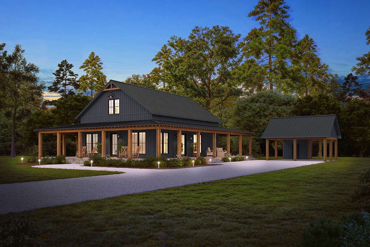 This attractive barndominium plan offers about 1,408 sq ft of heated living space designed to balance rustic charm with modern comfort. With 2 bedrooms and 2 full bathrooms, it’s a smart, efficient layout that feels open and welcoming while keeping everyday life simple and functional. The design blends country-style appeal with practical interior flow, making it ideal as a full-time residence, weekend retreat, or flexible countryside living space. 0