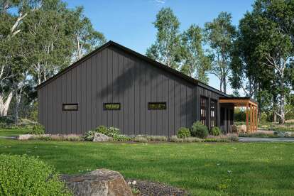 The exterior of this barndominium reflects classic barn-inspired design with clean lines and expansive roof pitches that convey strength and simplicity. A broad wraparound porch adds nearly 504 sq ft of outdoor living space—split into front and rear covered areas—that invites you to enjoy fresh air year-round. 1 This porch is ideal for rocking chairs, café tables, firepit gatherings, or simply stretching out with a good book in the shade. 2