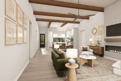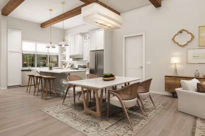 Stepping inside, the open floor plan immediately feels welcoming and natural. The combined living, dining, and kitchen areas are designed to maximize space and light, creating a fluid hub for daily life and social interaction. 4 Large windows and high ceilings help this central zone feel larger than its footprint, fostering an airy and connected atmosphere. 5