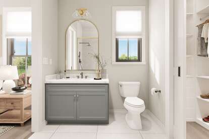 With two full bathrooms, this plan accommodates both household living and guest comfort. The shared bathroom adjacent to the second bedroom is configured for easy access, while the private primary bathroom enhances daily routines. 18 Thoughtful placement of these spaces supports smooth circulation throughout the home. 19