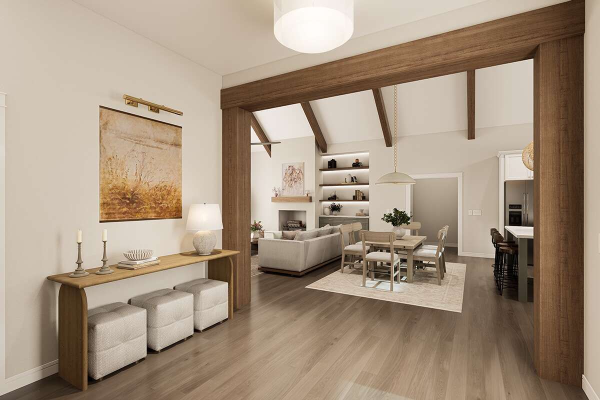 • Open central great room that blends living, dining, and kitchen areas for social living.