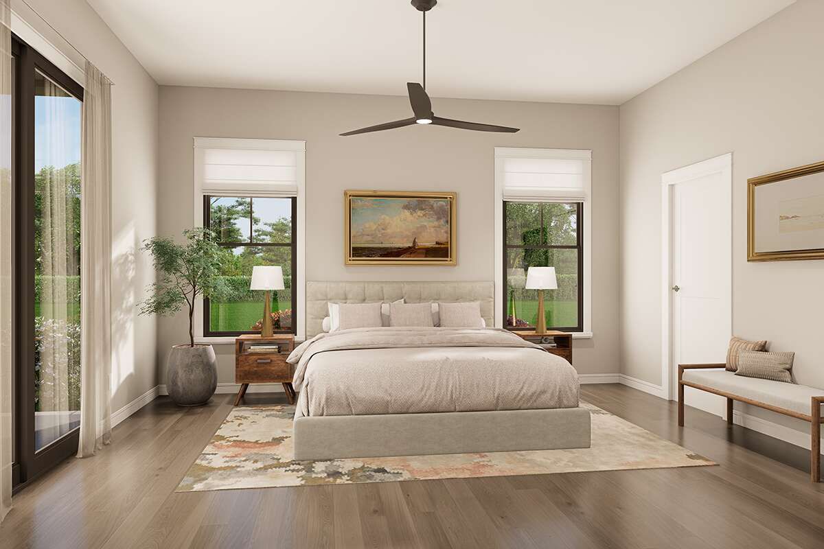 The primary bedroom suite is placed for privacy and comfort, offering room for restful furnishings, generous windows for natural light, and an attached full bathroom for convenience. 18 This suite feels like a peaceful escape within the home’s warm, open design. 19