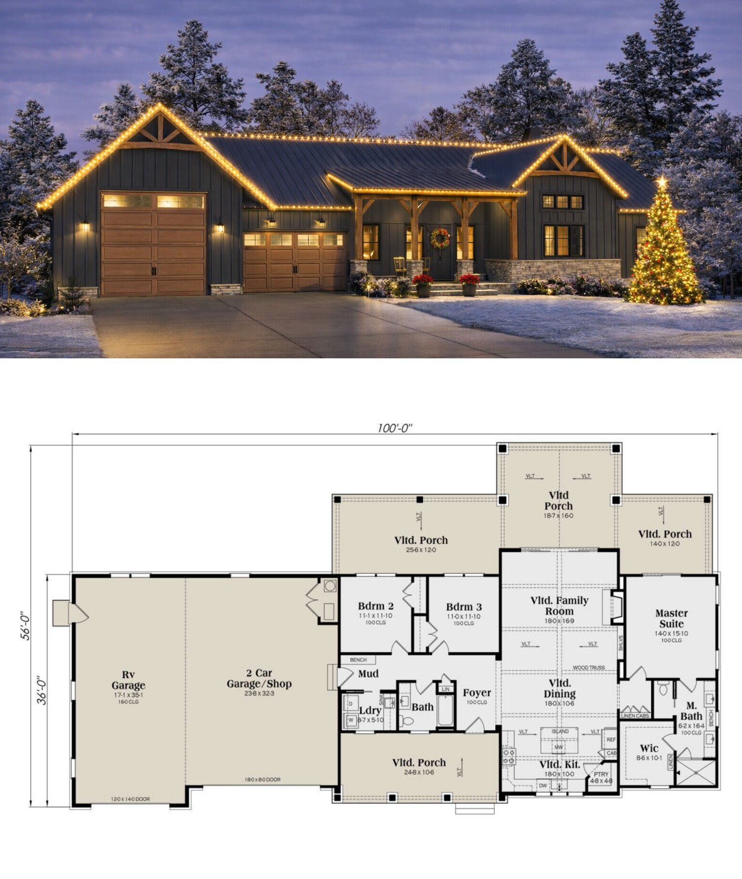 The exterior reflects classic barndominium styling — simple, bold rooflines and a strong rectangular form that echo traditional barn architecture but with a livable, elegant finish. 1 The long façade and generous proportions create a commanding presence on wide lots or rural settings, while durable materials and clean lines bring modern refinement to the rustic aesthetic. 2 Dimensions like ~100′ width × 56′ depth give the home footprint a grounded, spacious feel for both living and workspace. 3
