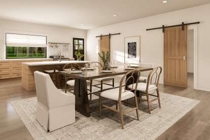 Step inside to a spacious central great room that anchors the plan. 7 This open area integrates living, dining, and kitchen zones into one cohesive space, making it a natural hub for family activity and social interaction. 8 Big windows and porch doors let in abundant daylight and visually connect the interior to the surrounding landscape, enhancing the sense of openness and comfort. 9