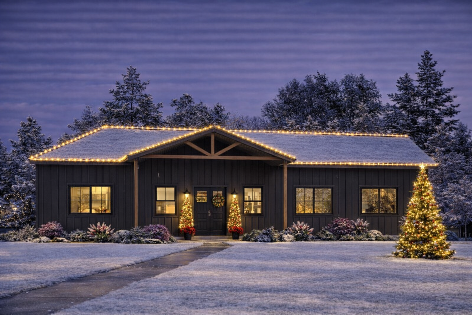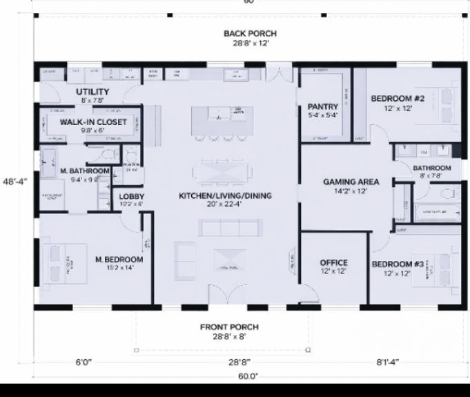 The barndominium exterior features classic barn-inspired proportions — broad rooflines, clean lines, and vertical siding that give it bold architectural presence. 1 At roughly 60′ wide × 40′ deep, the footprint provides generous width while maintaining a comfortable depth that suits wide lots and rural settings. 2 A generous covered front porch and roomy rear patio areas draw you outside, creating inviting spaces for relaxation, grilling, and enjoying fresh air. 3