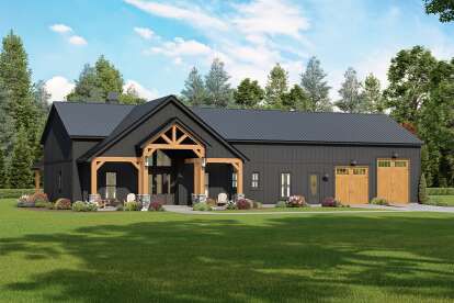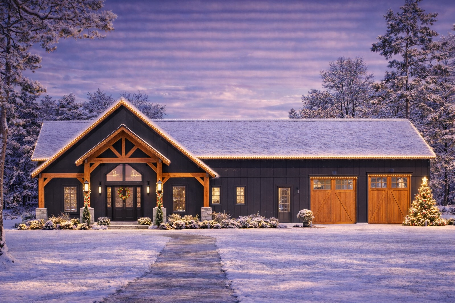 The exterior reflects the bold yet simple aesthetic of a modern barndominium — clear rooflines, strong geometry, and clean façades that feel both sleek and approachable. 1 A covered front porch welcomes you into the home, offering a relaxed outdoor living space perfect for morning coffee, evening conversations, or greeting neighbors. 2 This design bridges contemporary style with timeless rustic elements, making it suitable for both rural settings and modern neighborhoods. 3