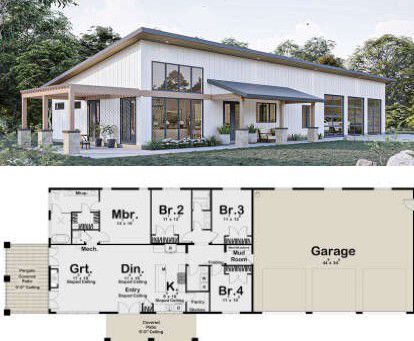 This barndominium plan delivers approximately 1,982 sq ft of open, well-organized living space that blends rustic character with contemporary comfort. Featuring 4 bedrooms and 2 full bathrooms, this design provides ample room for daily life, flexible zones for a variety of needs, and a layout that supports both privacy and connection. Whether you’re drawn to the industrial-inspired aesthetic or simply value open, adaptable spaces, this barndominium concept offers thoughtful planning and livability in a distinctive package.