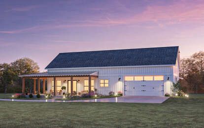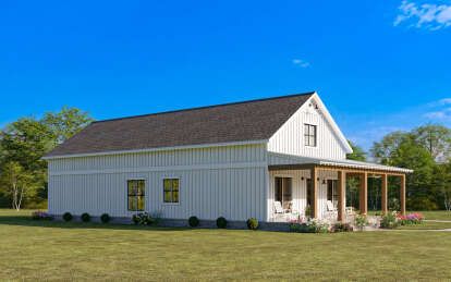 This barndominium plan balances modern comfort with rustic charm, offering open, efficient living spaces that feel larger than their square footage. Its thoughtful layout, generous porch, and practical features make it ideal for those seeking stylish, functional, and flexible space. Whether you’re hosting guests or enjoying everyday routines, this design provides comfort, character, and timeless appeal. 35