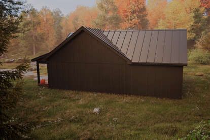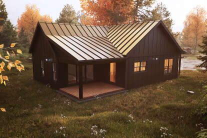 Exterior materials often include wood board-and-batten siding or other natural finishes that reinforce the cabin’s rustic aesthetic while remaining adaptable to personal tastes. The simple roof form and straightforward lines maintain classic cabin character. 3