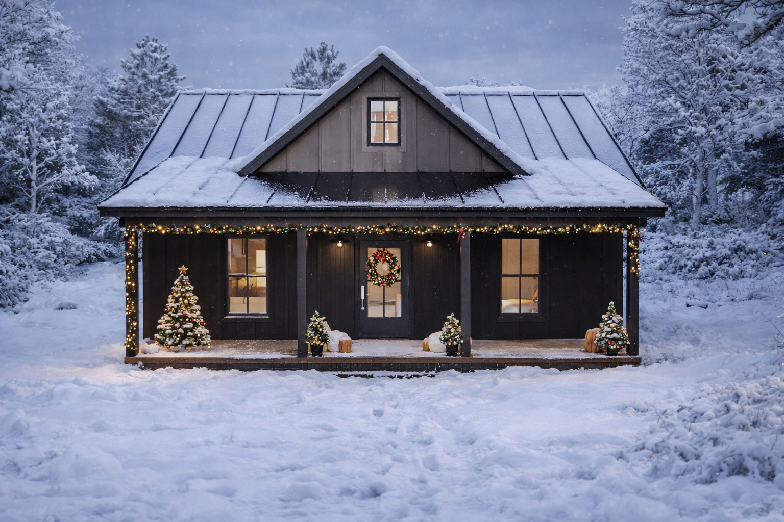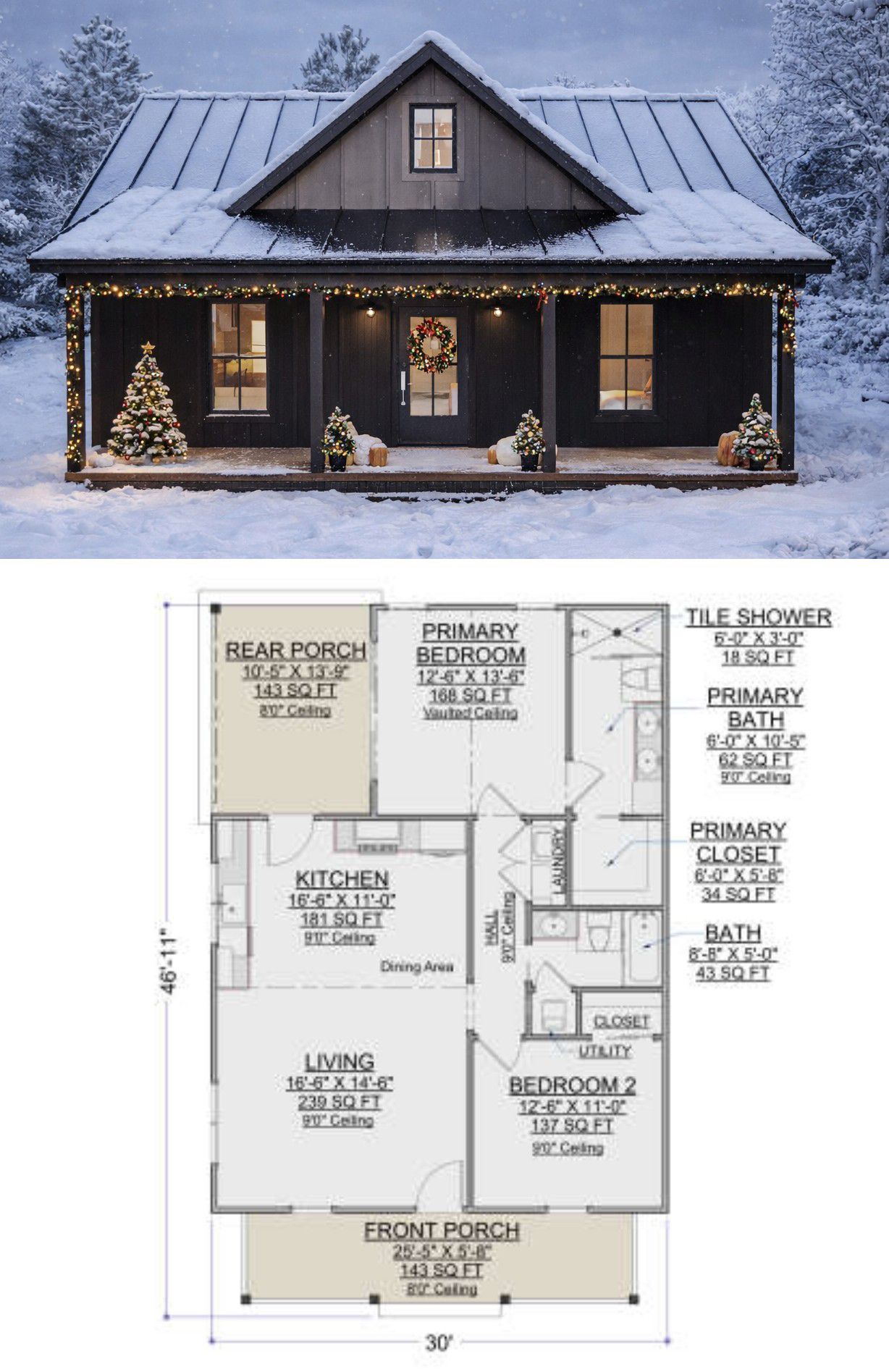 The exterior showcases timeless cabin appeal with clean, simple lines and a balanced rectangular footprint approximately 30 feet wide by 40 feet deep. 1