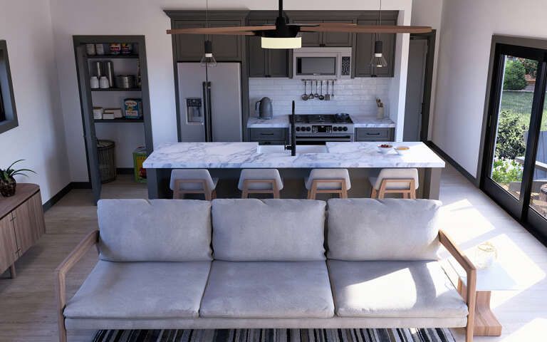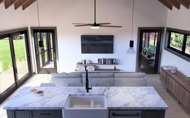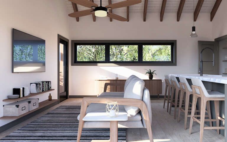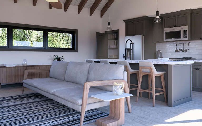 Inside, the floor plan prioritizes open, efficient use of space to make the most of the 740 sq ft. The living, dining, and kitchen areas flow together, creating a multifunctional central zone that supports both everyday living and entertaining. 2