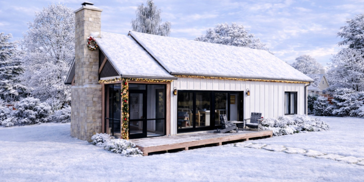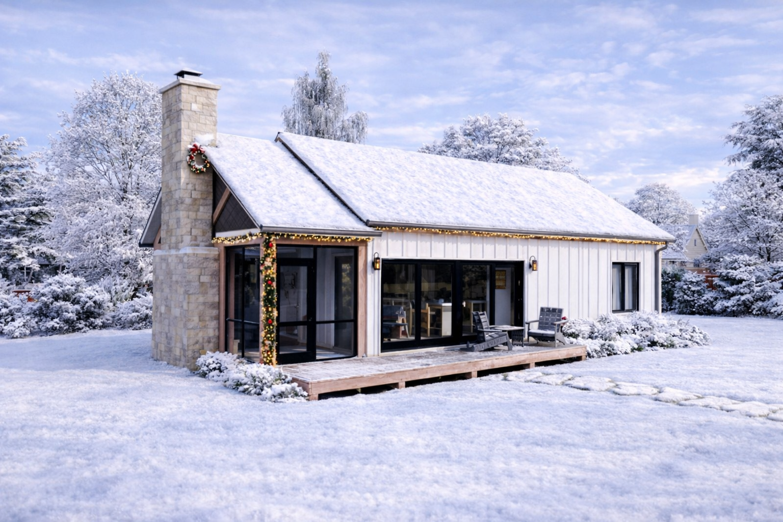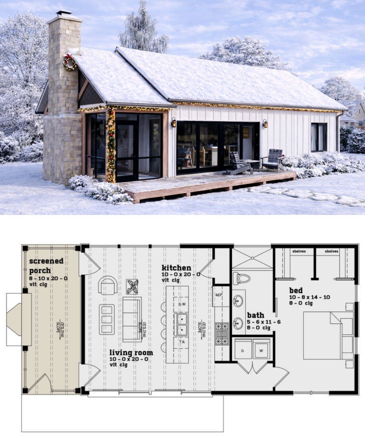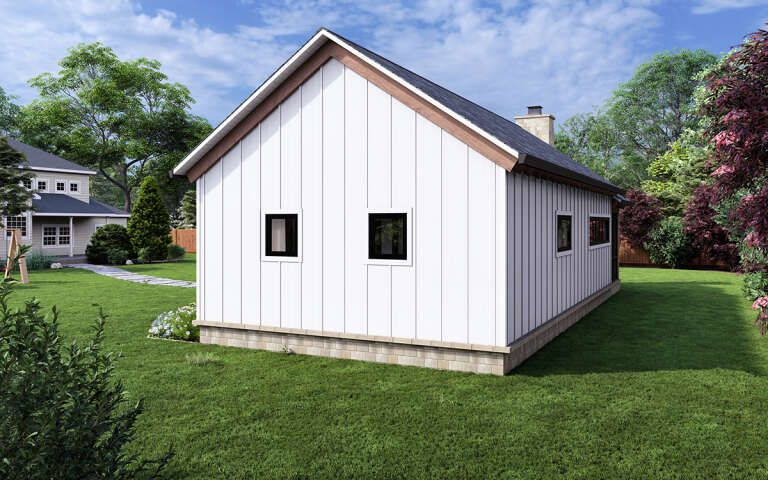 The exterior embraces a timeless cabin aesthetic with a compact footprint measuring roughly 45 feet wide by 20 feet deep. The modest scale and straightforward rooflines make it suitable for wooded lots, mountain retreats, lakeside settings, or rural property. Large windows and simple detailing help connect the interior with the outdoors and enhance the rustic charm. 1