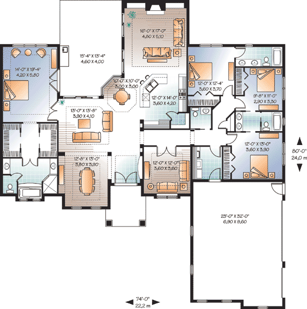The plan uses a split-bedroom layout: the master suite sits apart from the other bedrooms to ensure privacy and quiet. 6 The master suite offers its own full bathroom and access to private living spaces — a calm retreat after a busy day. 7