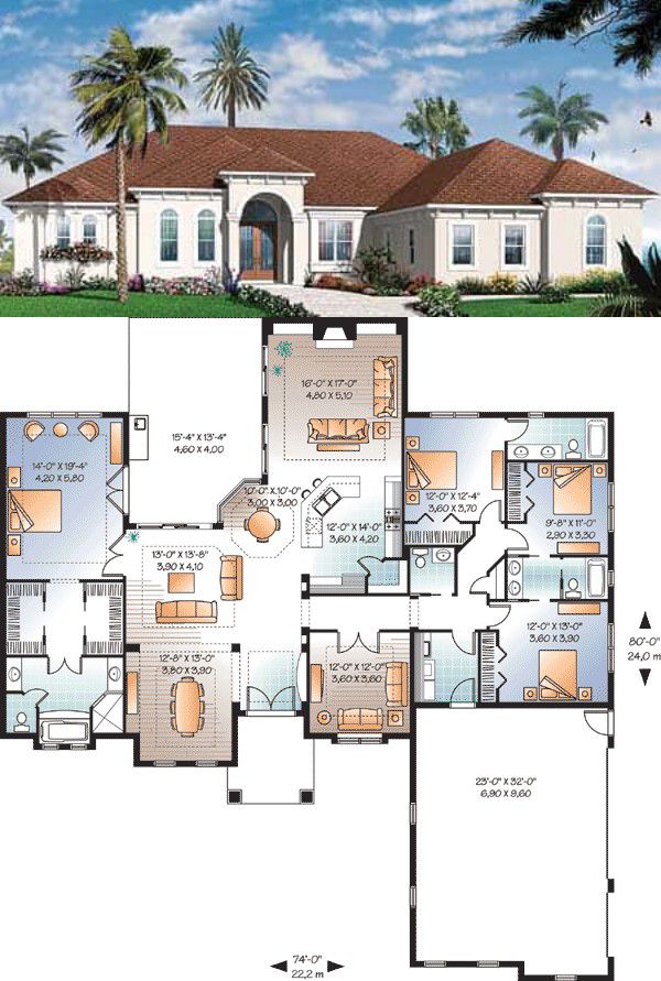The plan uses a split-bedroom layout: the master suite sits apart from the other bedrooms to ensure privacy and quiet. 6 The master suite offers its own full bathroom and access to private living spaces — a calm retreat after a busy day. 7