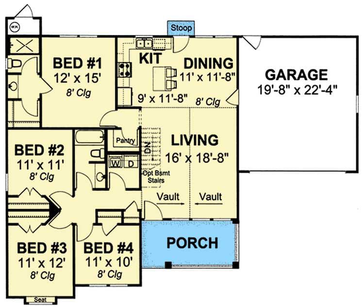This 4-bed Southern cottage manages to feel complete, welcoming and practical without ever becoming oversized. The vaulted living core gives it volume and personality, while the clustered bedrooms, main-level laundry, walk-in pantry and attached garage keep daily life running smoothly. For families, downsizers wanting extra bedrooms, or anyone craving a simple, charming home that lives larger than it looks on paper, this design offers a warm and efficient place to put down roots.