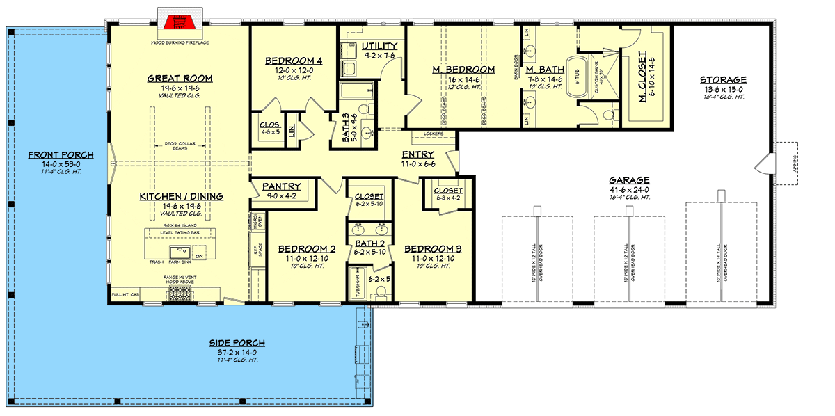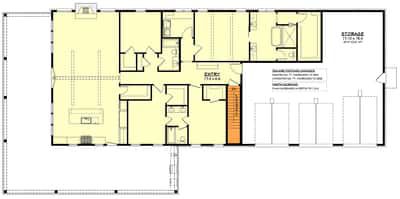 A standout feature is the oversized attached 3-car garage (1,260 sq ft), which doubles as a workshop and has overhead storage above the main living area — great for tools, equipment, or extra storage space. 12 The garage entry is placed on the side, allowing a full front facade free for porch and windows. 13