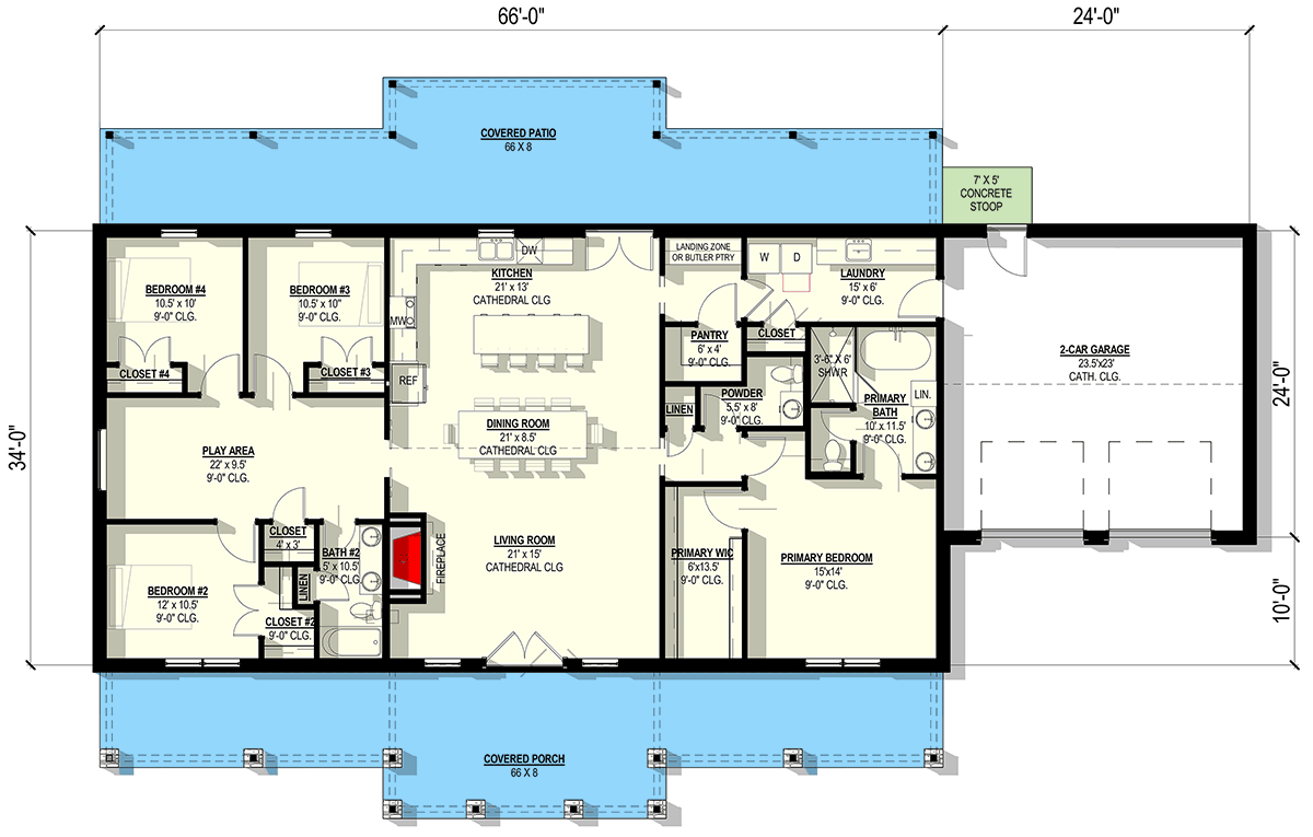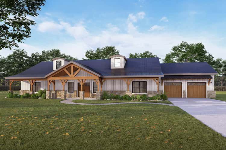 The exterior carries clean-lined country-Craftsman styling: a welcoming covered front porch, simple rooflines, and a balanced, approachable façade. 0 With width at 90′ and depth ~34′, the footprint remains manageable yet offers a substantial feel for a single-story home. 1 The side-entry 2-car garage helps keep the front view tidy, while the generous covered rear porch runs the full width of the house — adding real outdoor living appeal. 2