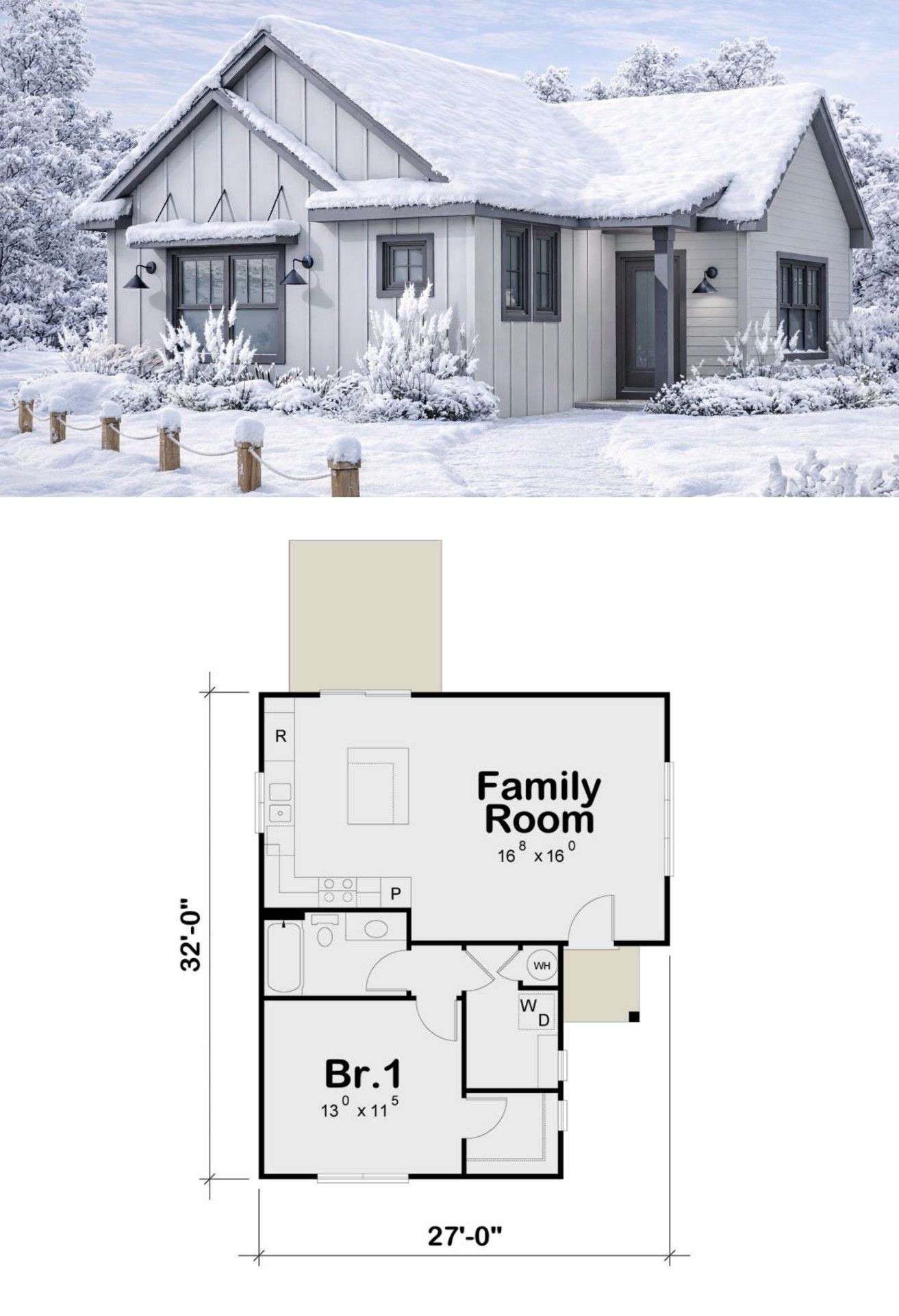 The exterior presents a classic cottage look with a compact structure measuring approximately 27 feet wide and 32 feet deep. 1 The small footprint makes it ideal for narrow lots, backyard builds, or vacation properties.