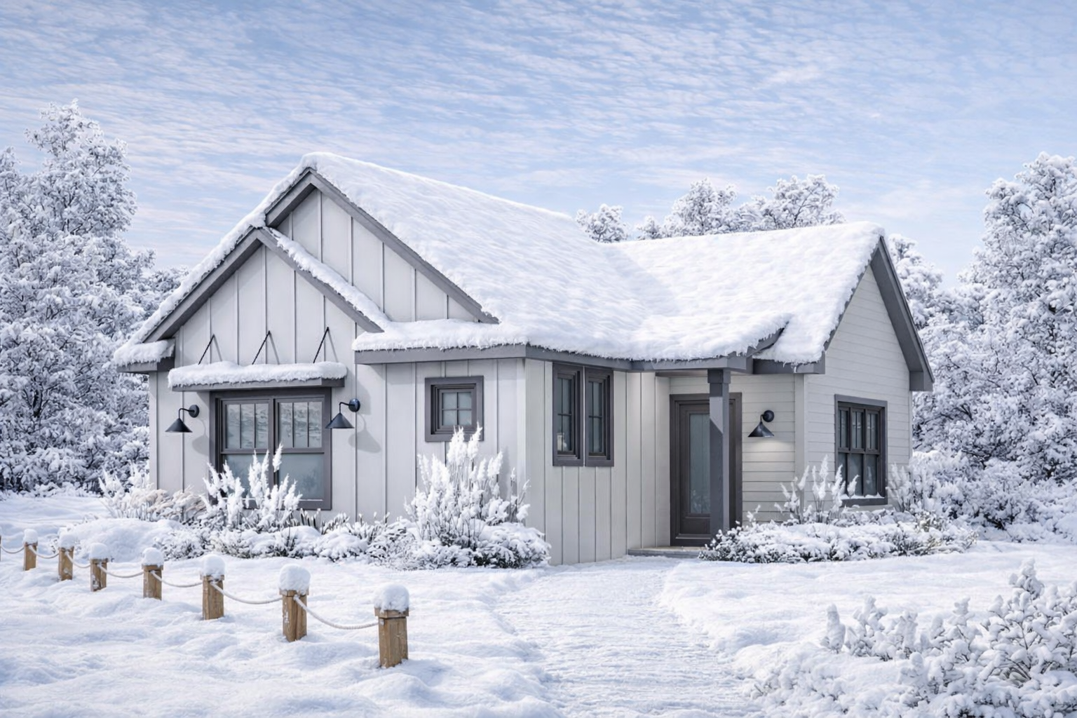 The exterior presents a classic cottage look with a compact structure measuring approximately 27 feet wide and 32 feet deep. 1 The small footprint makes it ideal for narrow lots, backyard builds, or vacation properties.