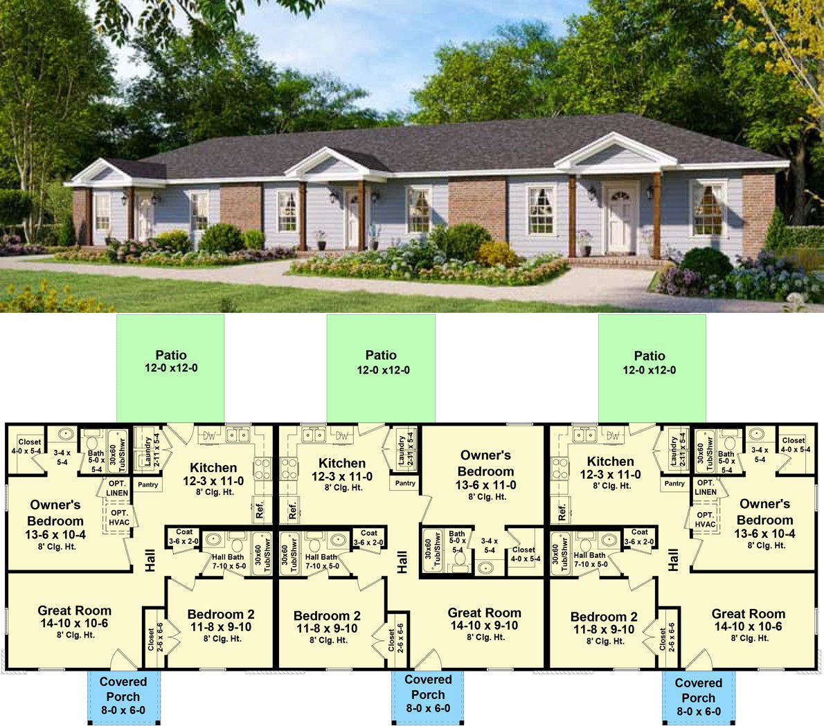 This overview describes the house layout and design of the tri-unit dwelling offered as “Triplex House Plan with 825 Sq Ft 2 Bedroom Units (Plan 51202MM)”. It’s a cost-efficient, space-saving design ideal for a multi-family building or small rental property — or even a multigenerational home under one roof.