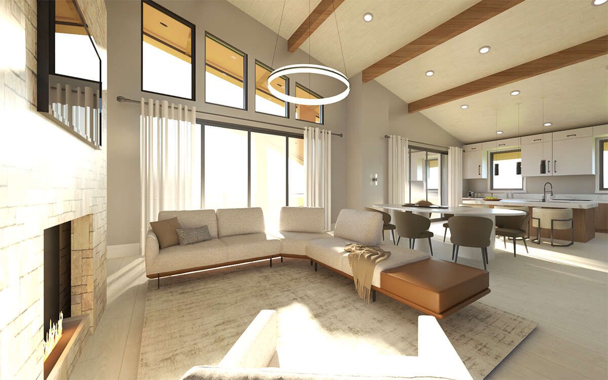 The heart of the home features an open floor plan connecting the living room, kitchen, and dining area into one spacious central gathering zone.