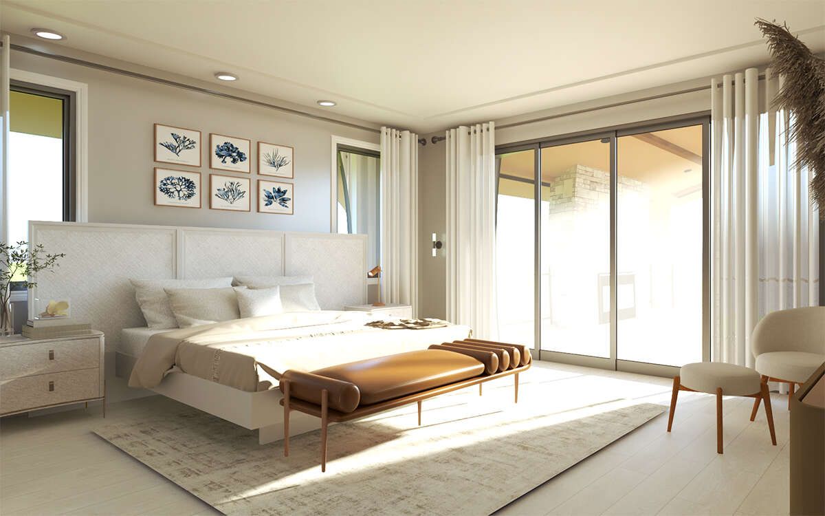 The split-bedroom design places the owner’s suite separate from the secondary bedroom areas, improving privacy and reducing noise between sleeping zones.