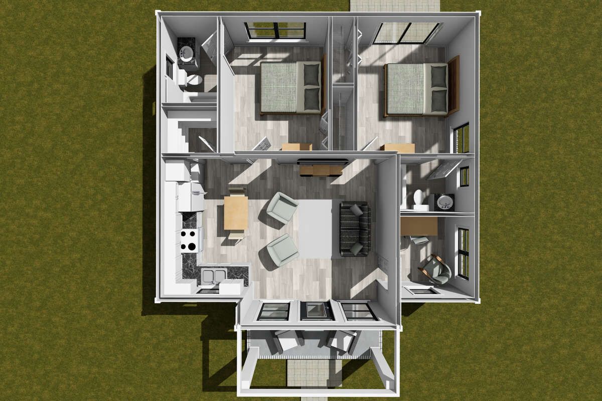 With 2 full bathrooms, this plan delivers a level of comfort that’s rare in a home under 900 sq ft. This feature makes daily life much smoother—especially for households with more than one person. No more waiting for the bathroom, no more “I’ll be quick” negotiations, and no more awkward guest situations.
