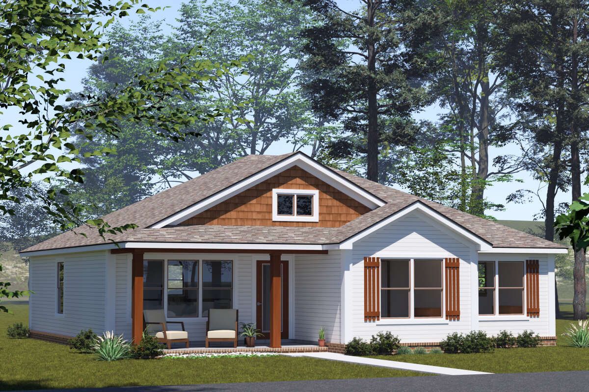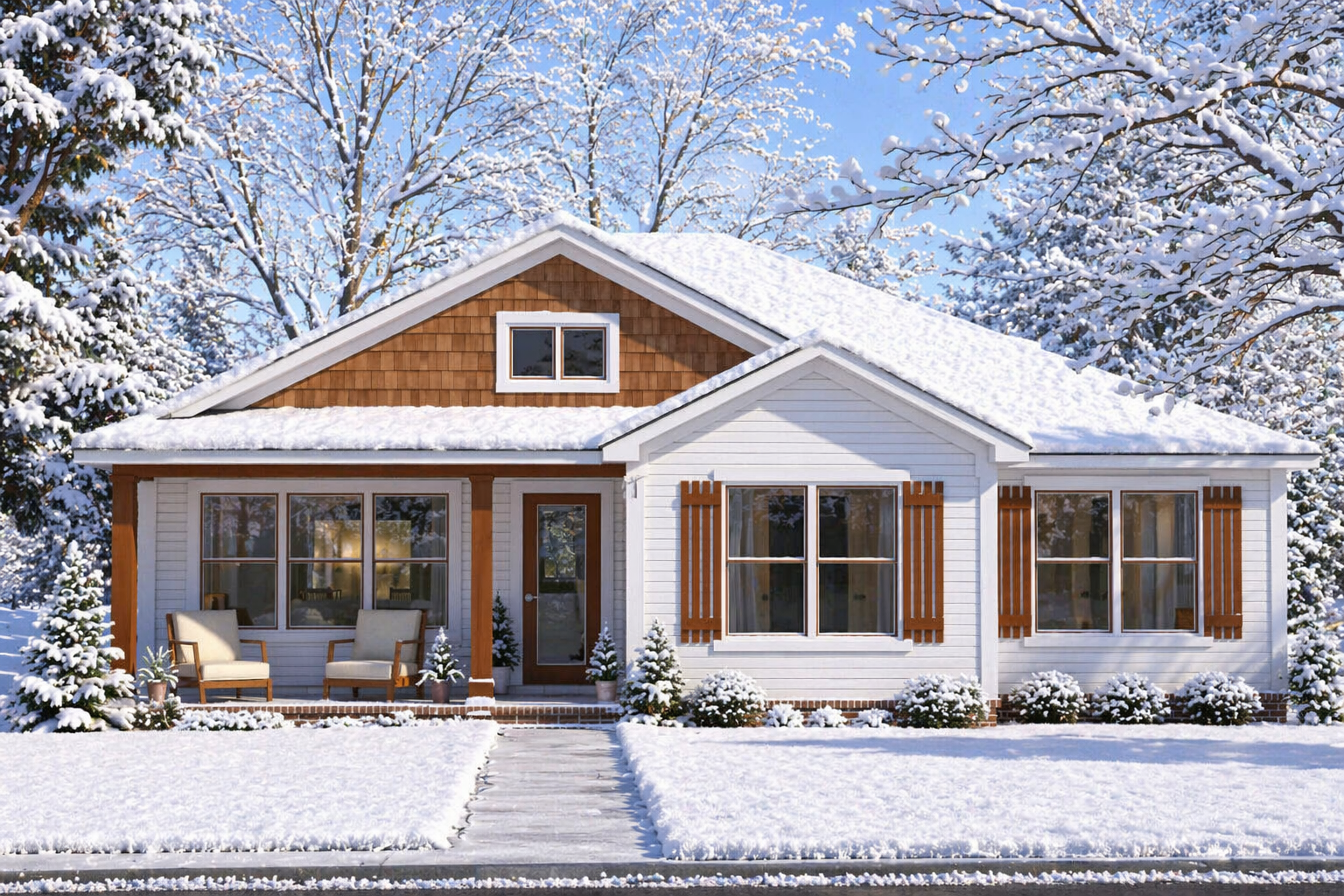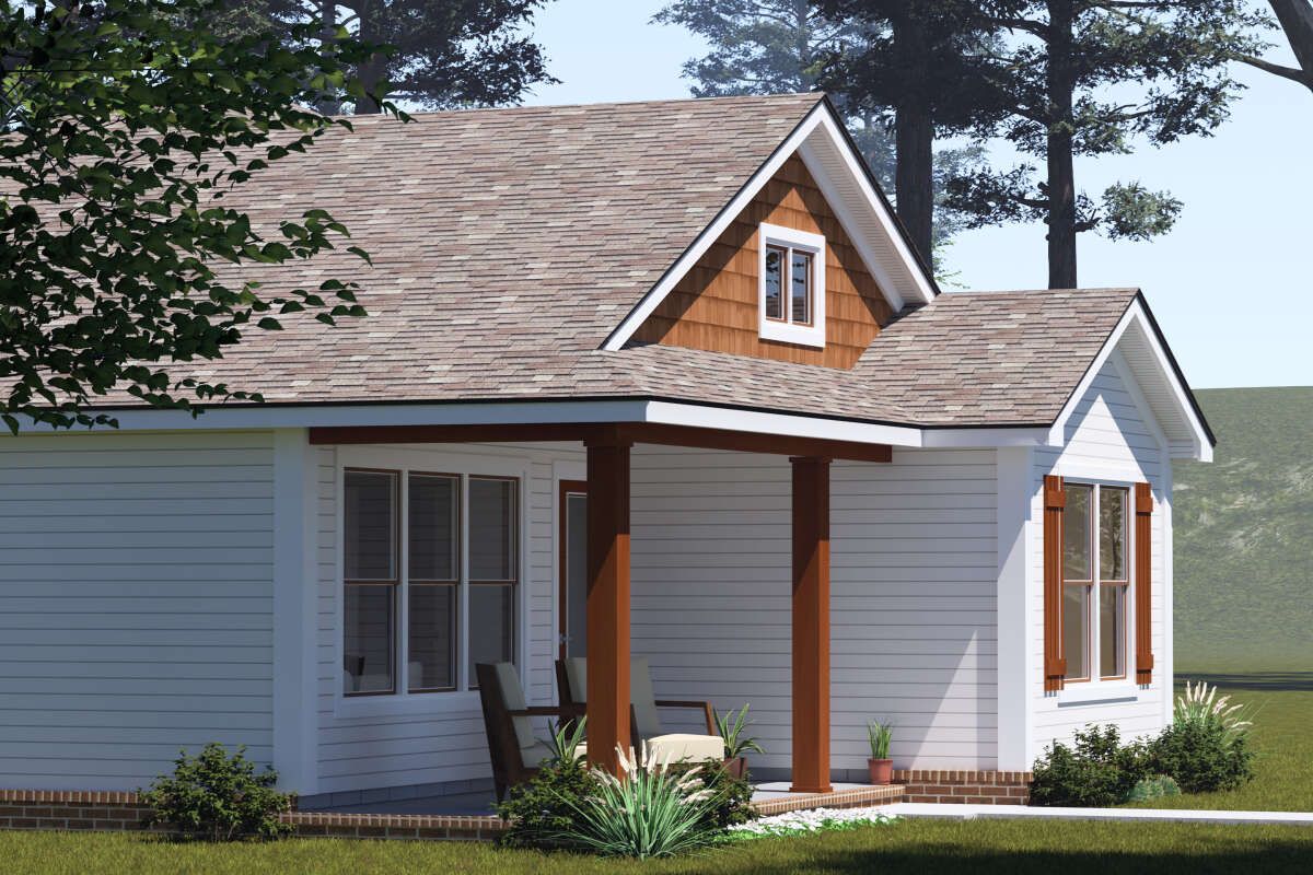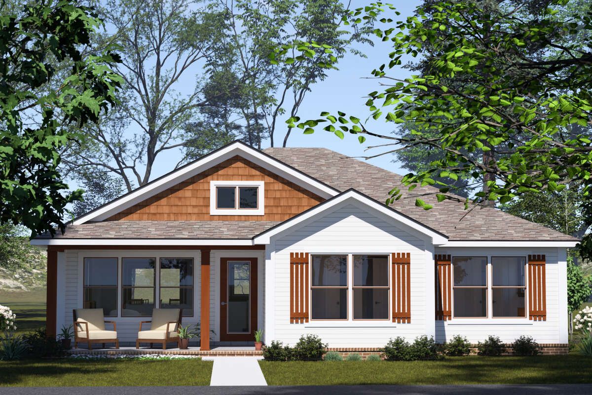 The exterior showcases a classic cottage style with a compact and symmetrical design. Clean lines, a simple roof structure, and a welcoming front appearance give the home a warm and inviting character.