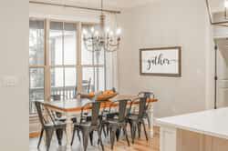 The kitchen is designed with both practicality and style in mind. Ample counter space, storage cabinetry, and a central island help create a functional cooking environment. Nearby dining space allows meals to be served conveniently while maintaining visual connection to the living room.