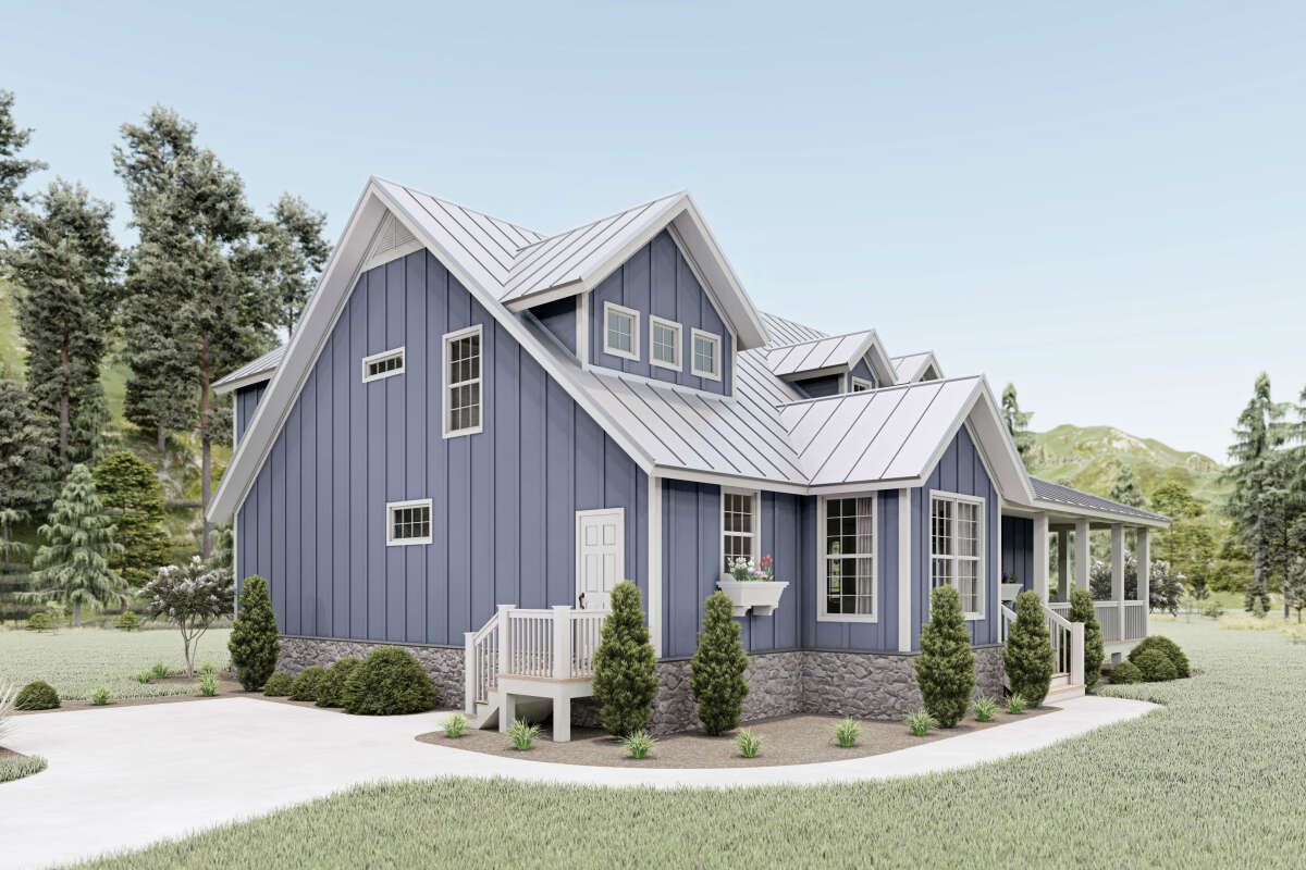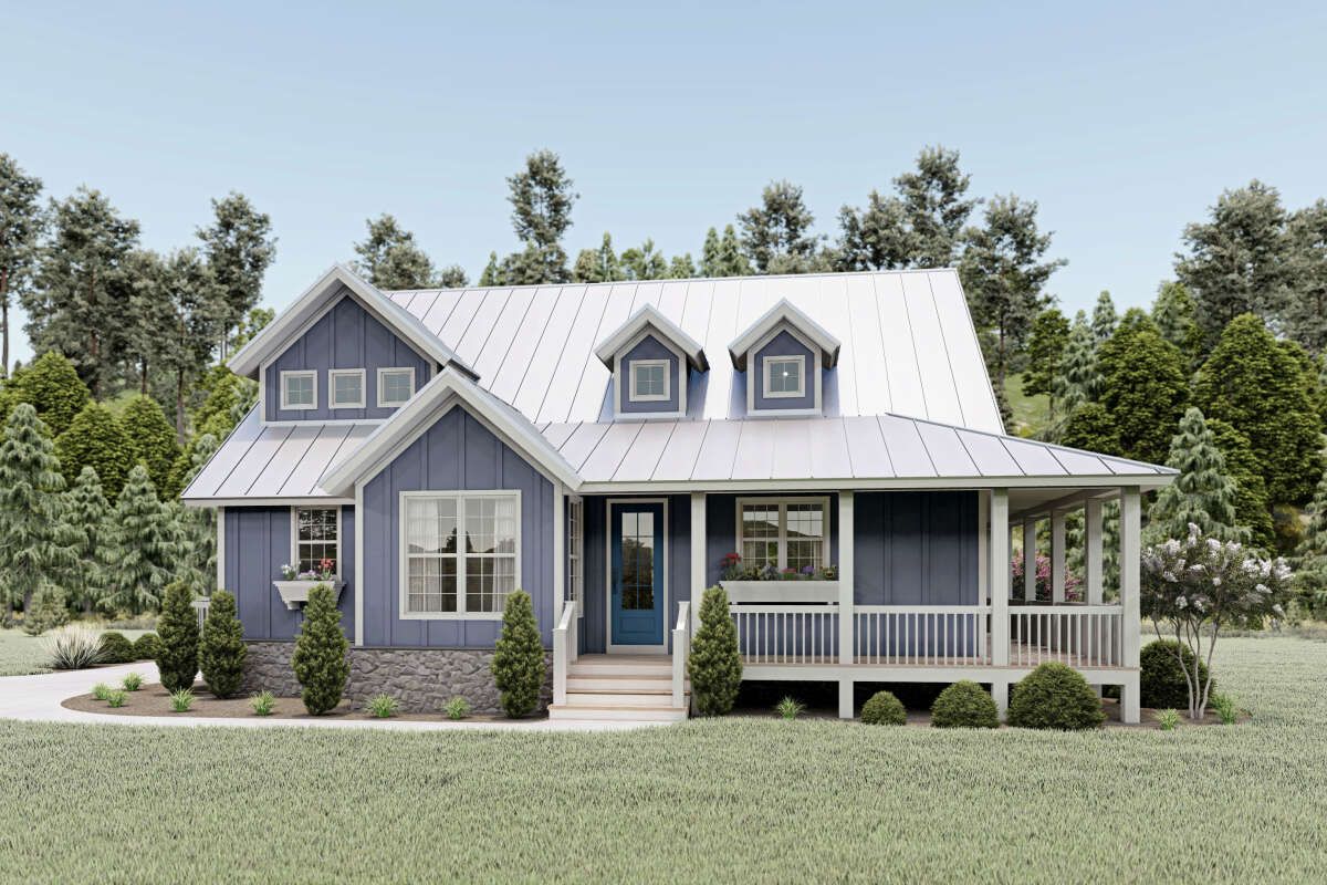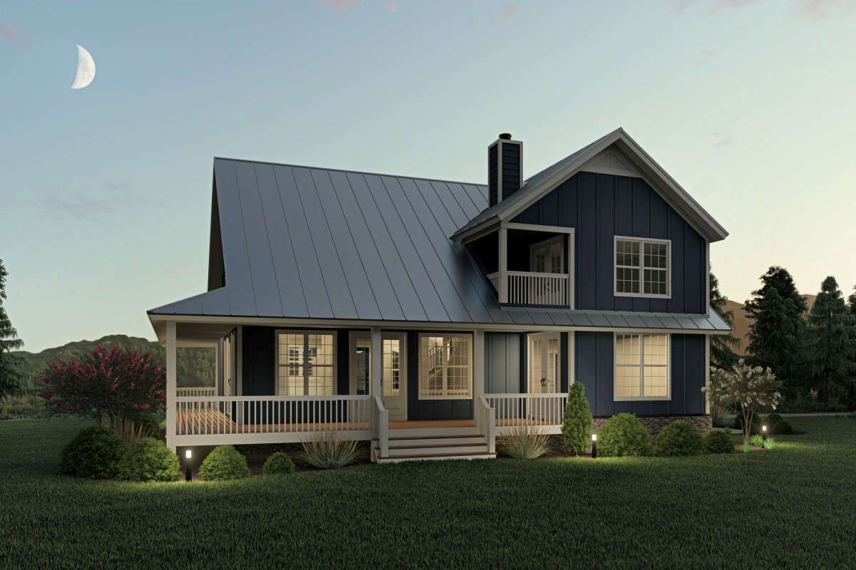 This country farmhouse plan offers a perfect blend of traditional charm and modern functionality. With its wraparound porch, open interior, and flexible two-story layout, it provides a comfortable and stylish home for families seeking both space and character.