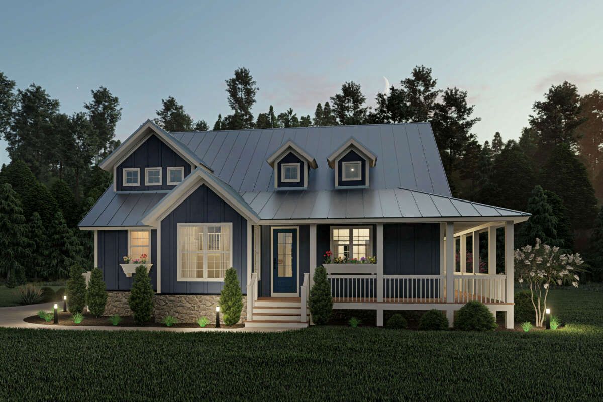 This country farmhouse plan offers a perfect blend of traditional charm and modern functionality. With its wraparound porch, open interior, and flexible two-story layout, it provides a comfortable and stylish home for families seeking both space and character.