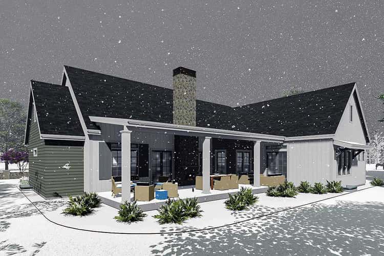 Outdoor living plays a starring role in this design. In addition to the generous front porch (~336 sq ft), a rear covered patio (~654 sq ft) creates an expansive outdoor room that feels like an extension of the main living area. 4 With two sets of double doors leading out from the house, it’s effortless to take everyday meals outside, host weekend barbecues, or simply soak in sunsets and scenic views. 5 Whether morning coffee or evening relaxation, these outdoor spaces make most days feel a bit more special. 6
