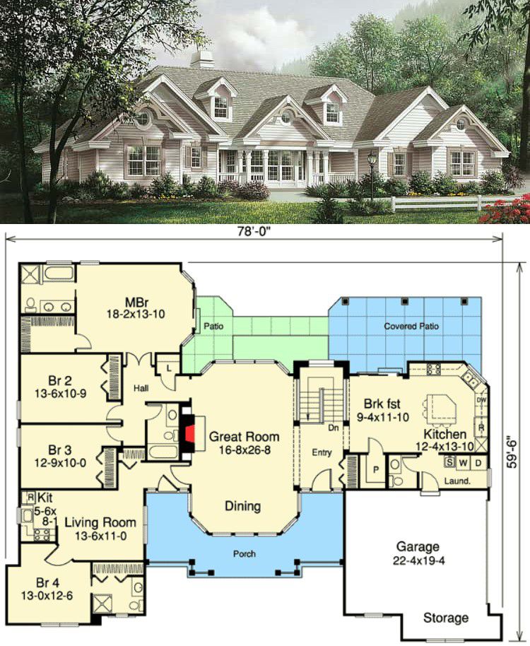 - Dimensions: ~78′ wide × ~59′ 6″ deep; ridge height ~24′ 15