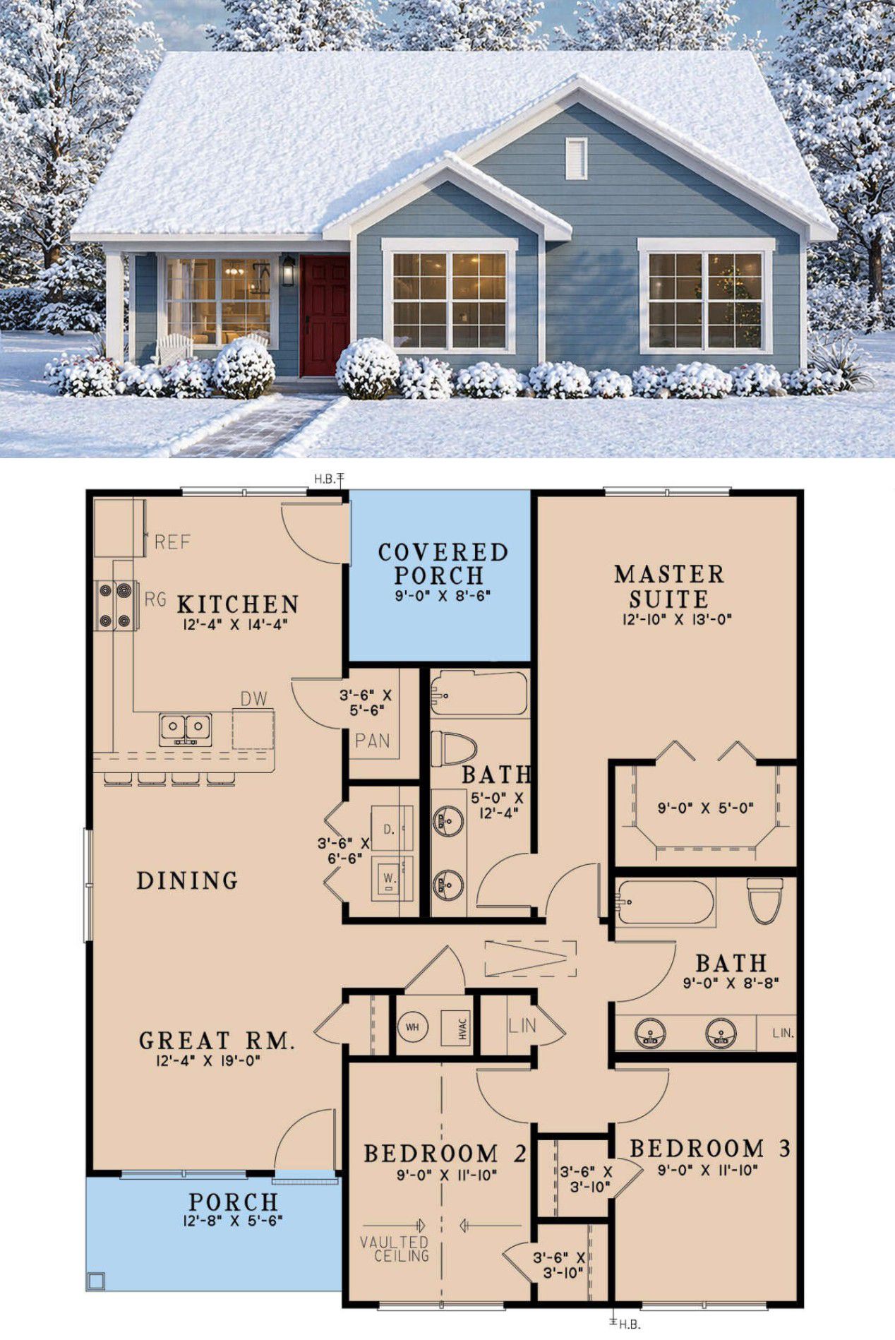 This compact and efficient home offers approximately 1,279 square feet of heated living space with three bedrooms and two full bathrooms. The layout featured in