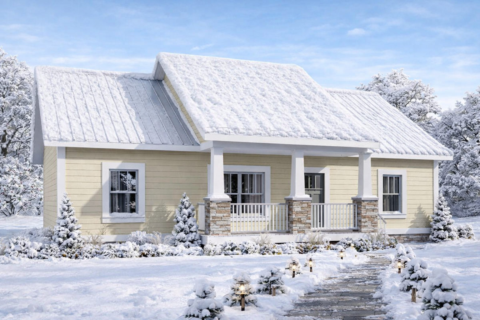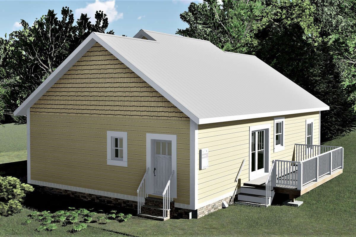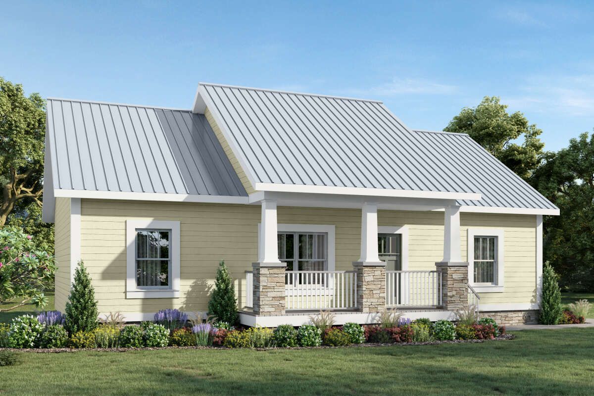 A simple roofline and traditional styling create a timeless look, while a modest front porch enhances curb appeal and provides a pleasant outdoor sitting area.