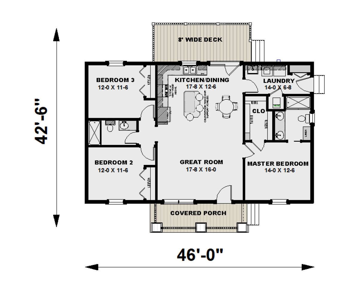 The home measures approximately 46 feet in width and 42 feet 6 inches in depth, with all living space contained on a single level. 9