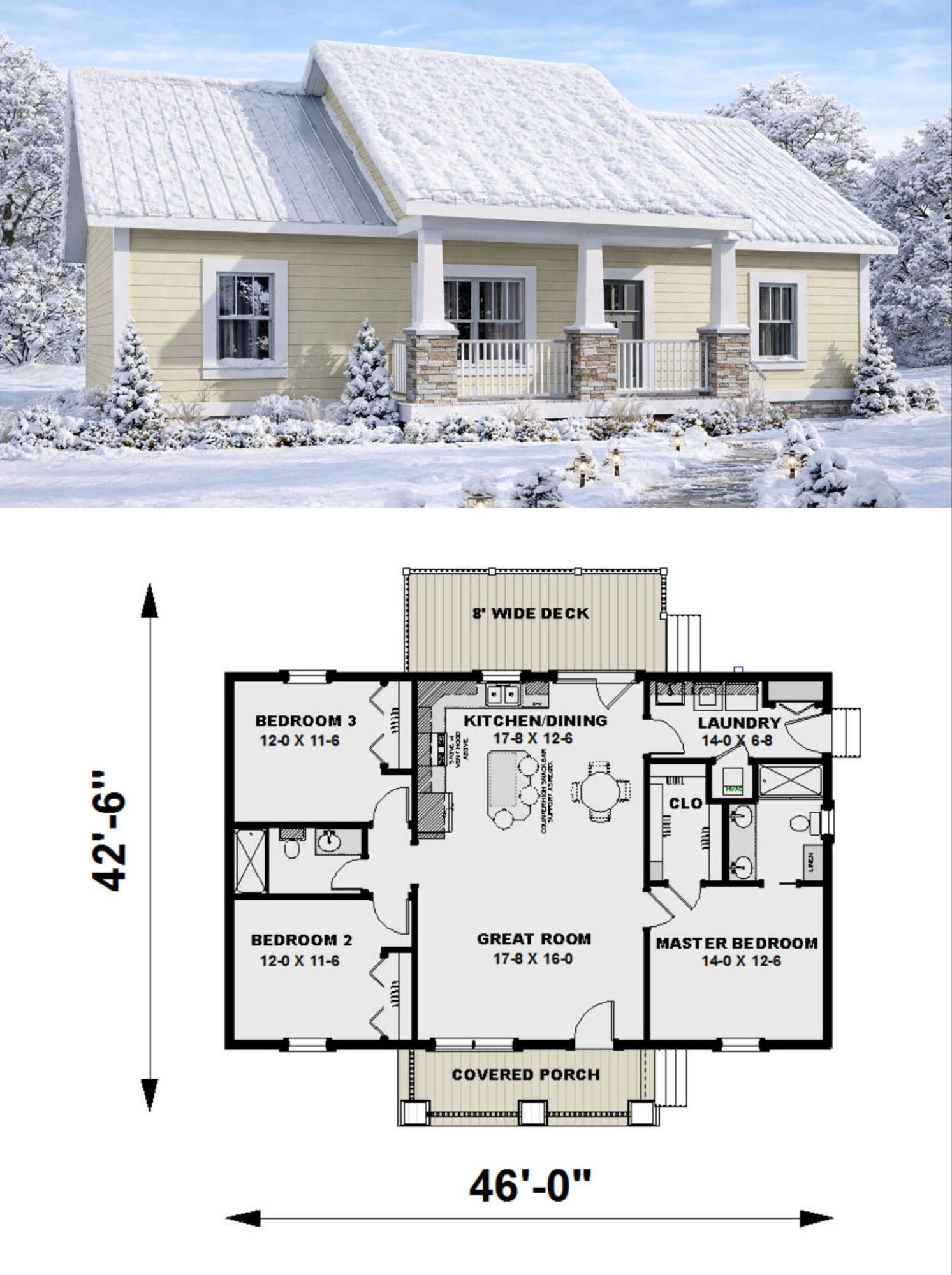 The exterior reflects classic country charm with a clean and balanced footprint measuring approximately 46 feet wide and 42 feet 6 inches deep. 1 This size allows the home to fit comfortably on a variety of lot sizes while maintaining a welcoming presence.