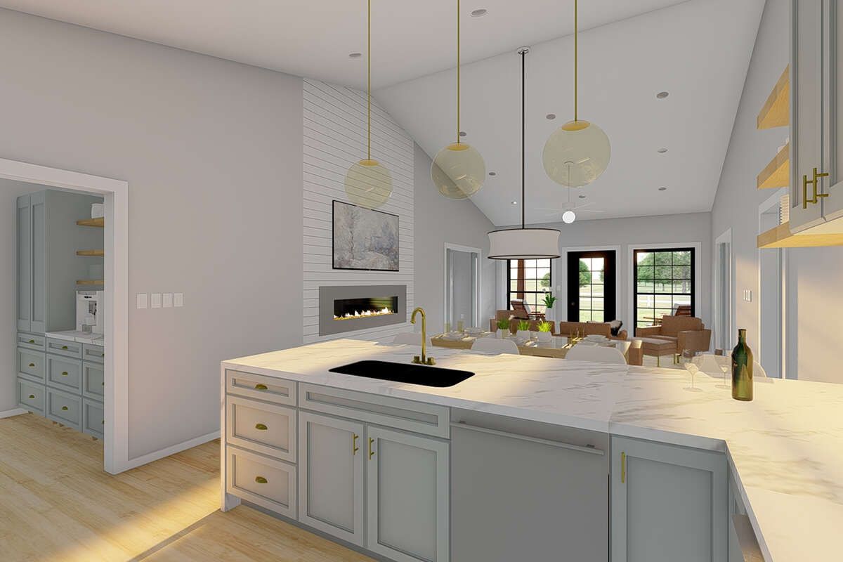 This practical setup ensures the kitchen remains both functional and connected to the rest of the home.