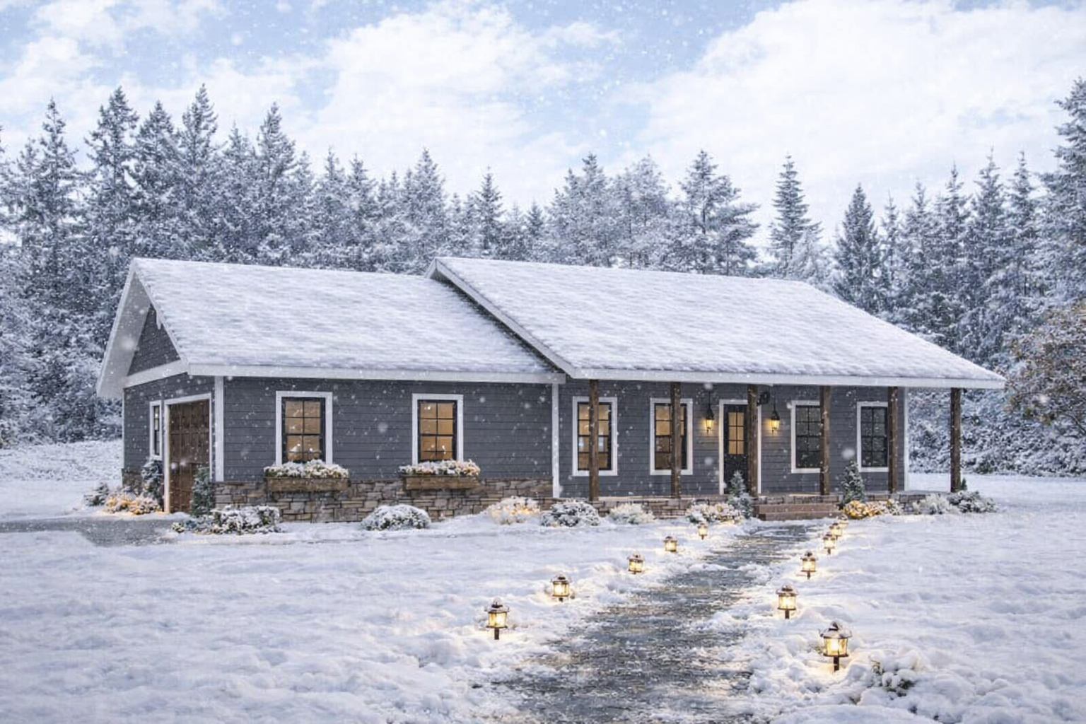 The exterior reflects classic country charm with a clean, welcoming façade and a balanced structure. The home measures approximately 56 feet wide and 46 feet deep, making it suitable for a variety of lot sizes while maintaining strong curb appeal. 1