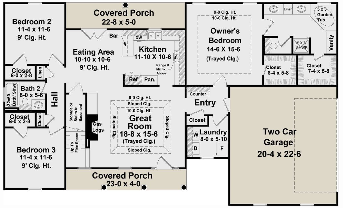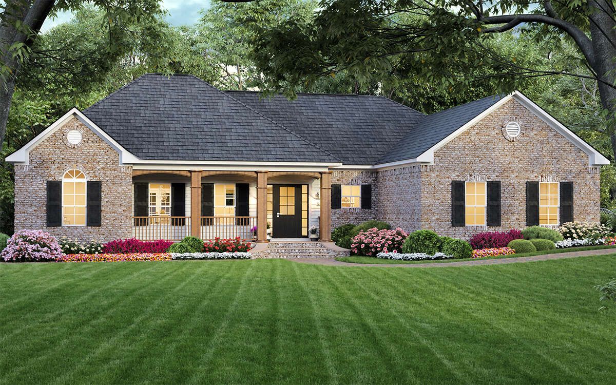 This country house plan combines classic architectural charm with a practical layout and efficient use of space. Its single-story design, open living areas, and comfortable bedroom arrangement make it a versatile and appealing choice for modern family living.