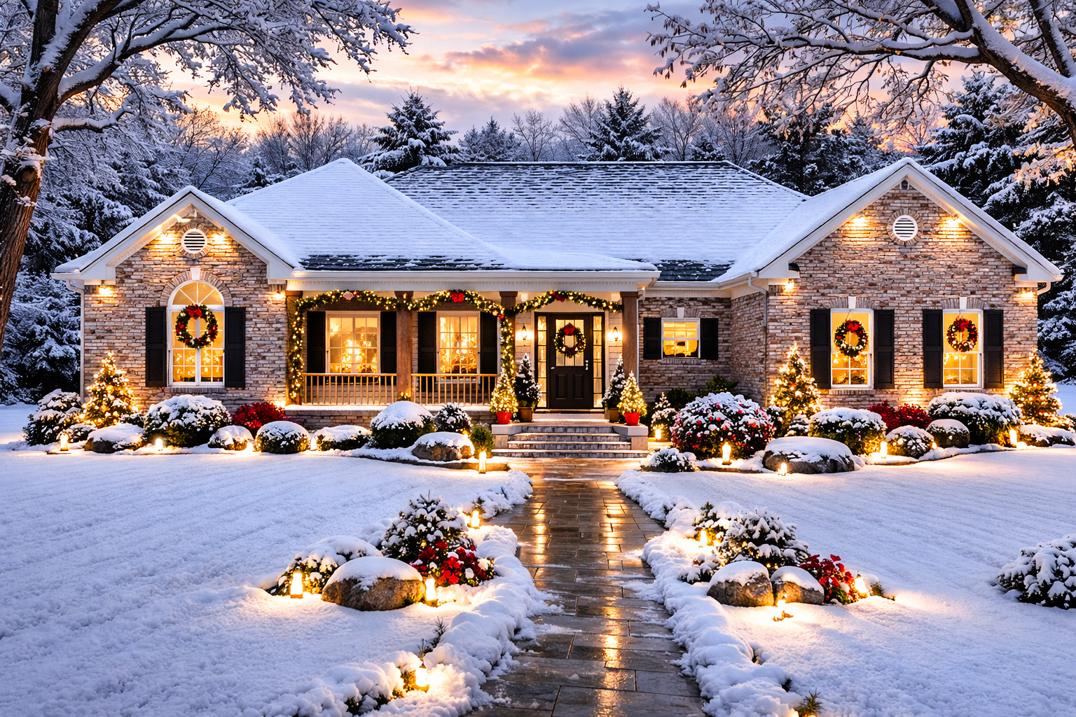 The exterior showcases the warm and inviting character typical of country-style homes. A wide footprint measuring approximately 64 feet in width and 39 feet in depth gives the house a balanced and grounded presence on the lot. 1