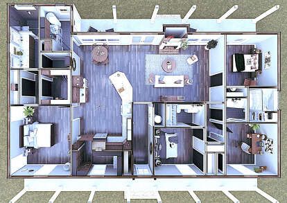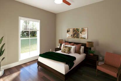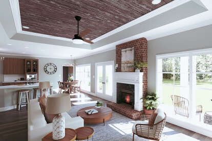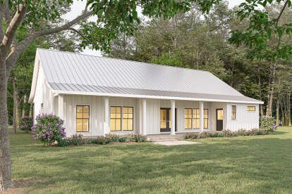 The exterior exudes inviting country charm with a balanced façade, covered entry porch, and thoughtfully placed windows that give the home a welcoming presence. 1 Simple rooflines and tasteful trim details keep the design timeless and approachable, perfect for suburban neighborhoods or rural settings. 2 A modest front porch area creates an everyday outdoor space — ideal for morning coffee or casual neighborly chats. 3