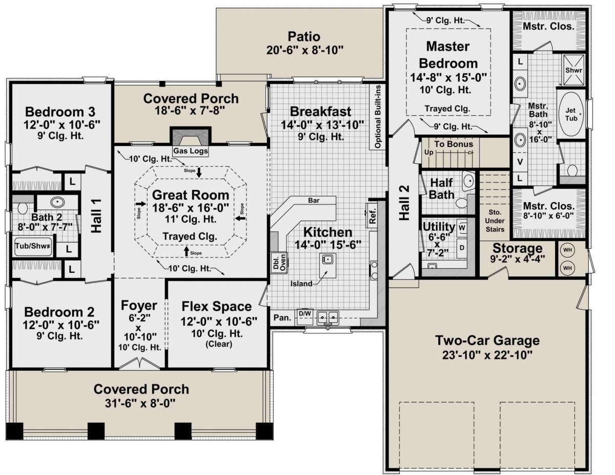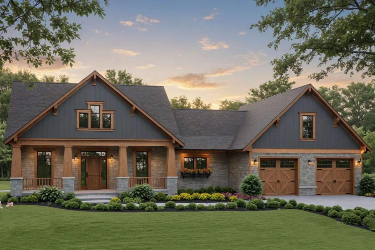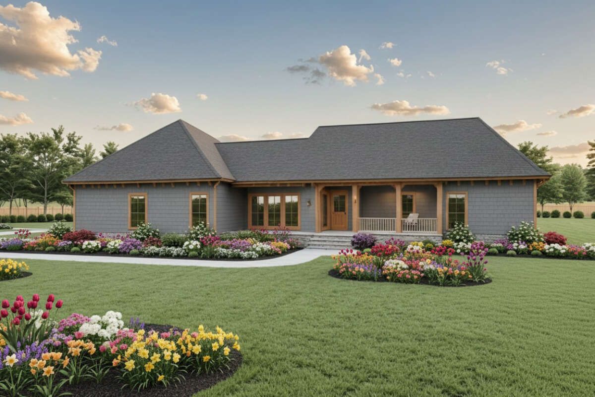 The design incorporates a split-bedroom layout, placing the primary suite on one side of the home and the other bedrooms on the opposite side.