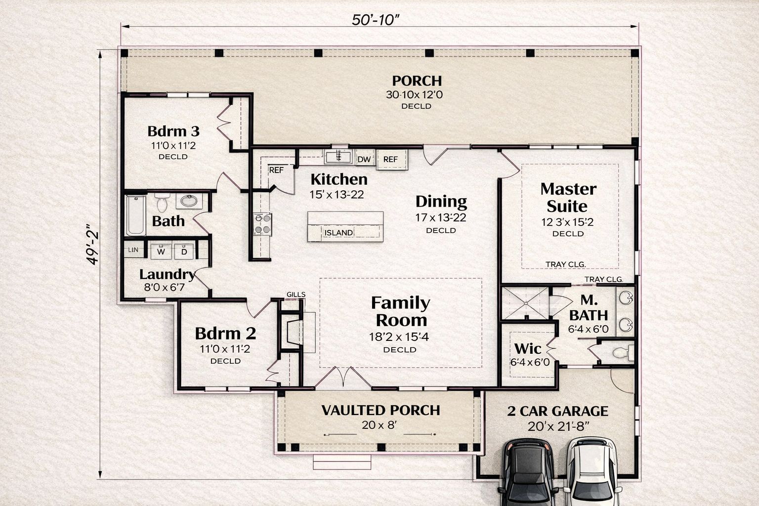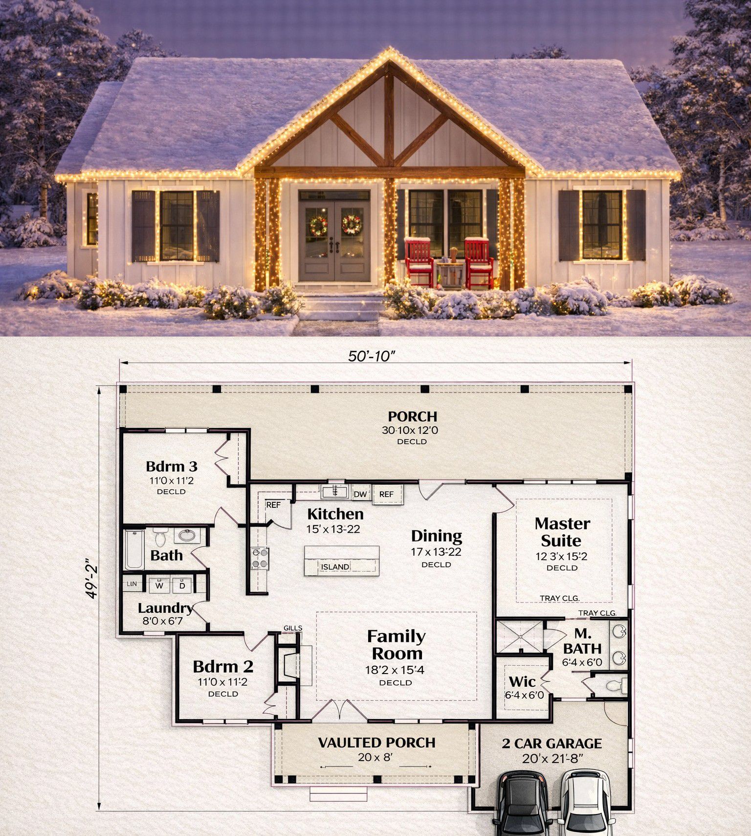 This charming country house design delivers about 1,647 sq ft of well-planned living space that blends timeless exterior appeal with a functional interior layout. With 3 bedrooms, 2 full bathrooms, a convenient half bath, and a 2-car garage, this single-level home offers a comfortable and efficient floor plan — perfect for families, growing households, or anyone seeking thoughtful everyday living. 0