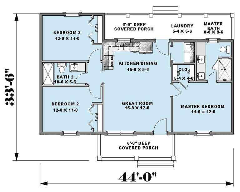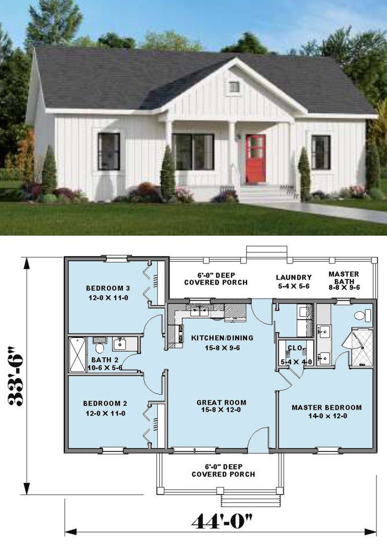 The exterior combines simple, timeless country styling with clean lines and a welcoming presence. 1 A covered front porch stretches across the façade, creating an immediate sense of arrival and offering a comfortable spot for morning coffee or evening chats. 2 With an overall footprint roughly **44′ wide × 33′ 6″ deep**, the home strikes a balance between compact efficiency and substantial visual appeal. 3