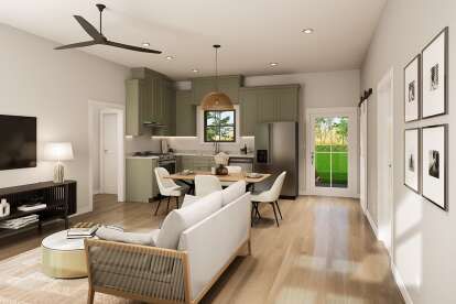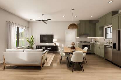 The kitchen is positioned for both convenience and efficiency. 11 Functional counters and cabinetry support daily meal prep while maintaining a connection to the dining and living zones. 12 Its compact scale ensures everything you need is within reach, and thoughtful design ensures it feels open rather than cramped. 13