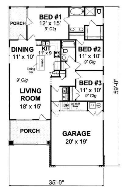 The exterior elevates traditional bungalow charm with bright-hued brick accents, stately tapered beams, and a gently pitched gable roof. 1 A generous front porch lends classic curb appeal and provides a relaxed outdoor spot for morning coffee or catching up with neighbors. 2 With an overall footprint roughly 35′ wide × 59′ deep, this home sits comfortably on a modest lot while projecting a balanced, timeless aesthetic. 3
