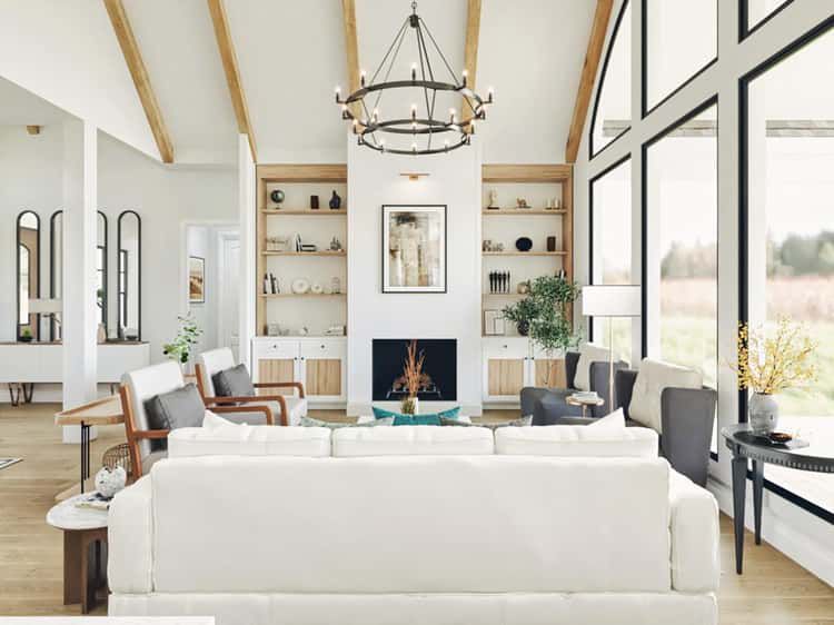 The heart of the home is a spacious lodge-style great room with a dramatic vaulted ceiling. Exposed timber trusses enhance the rustic Craftsman feel while creating a warm and inviting atmosphere. 5