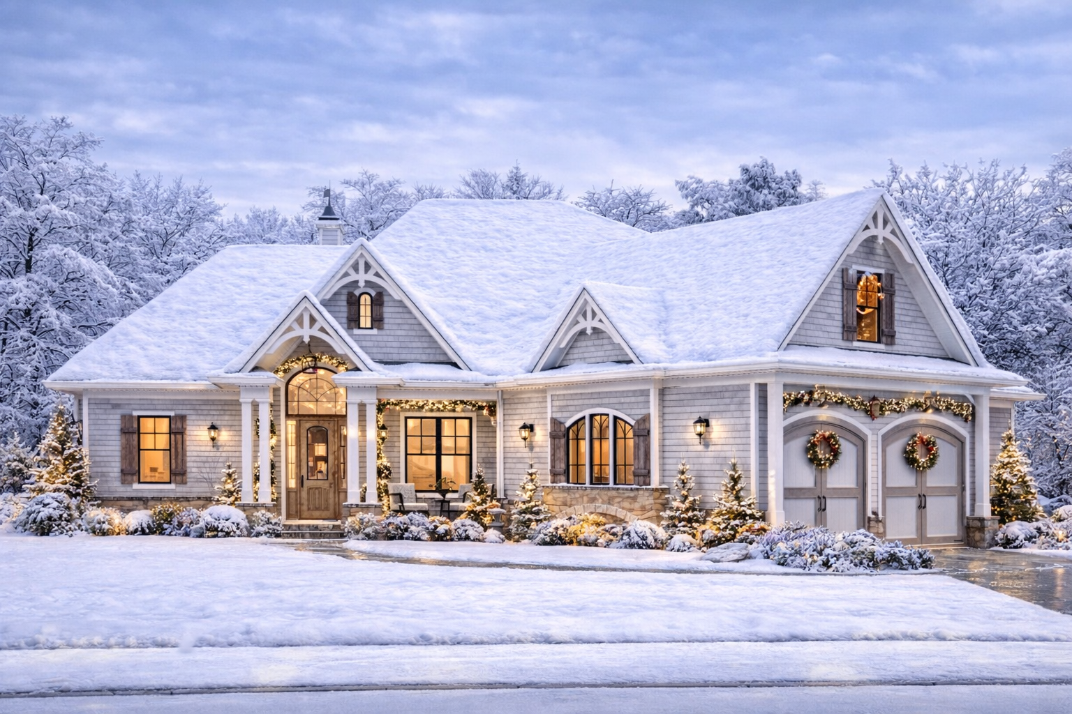 The roof structure features a steep 10:12 pitch on the main section and an even steeper 12:12 pitch over the garage, contributing to both durability and a bold visual presence.