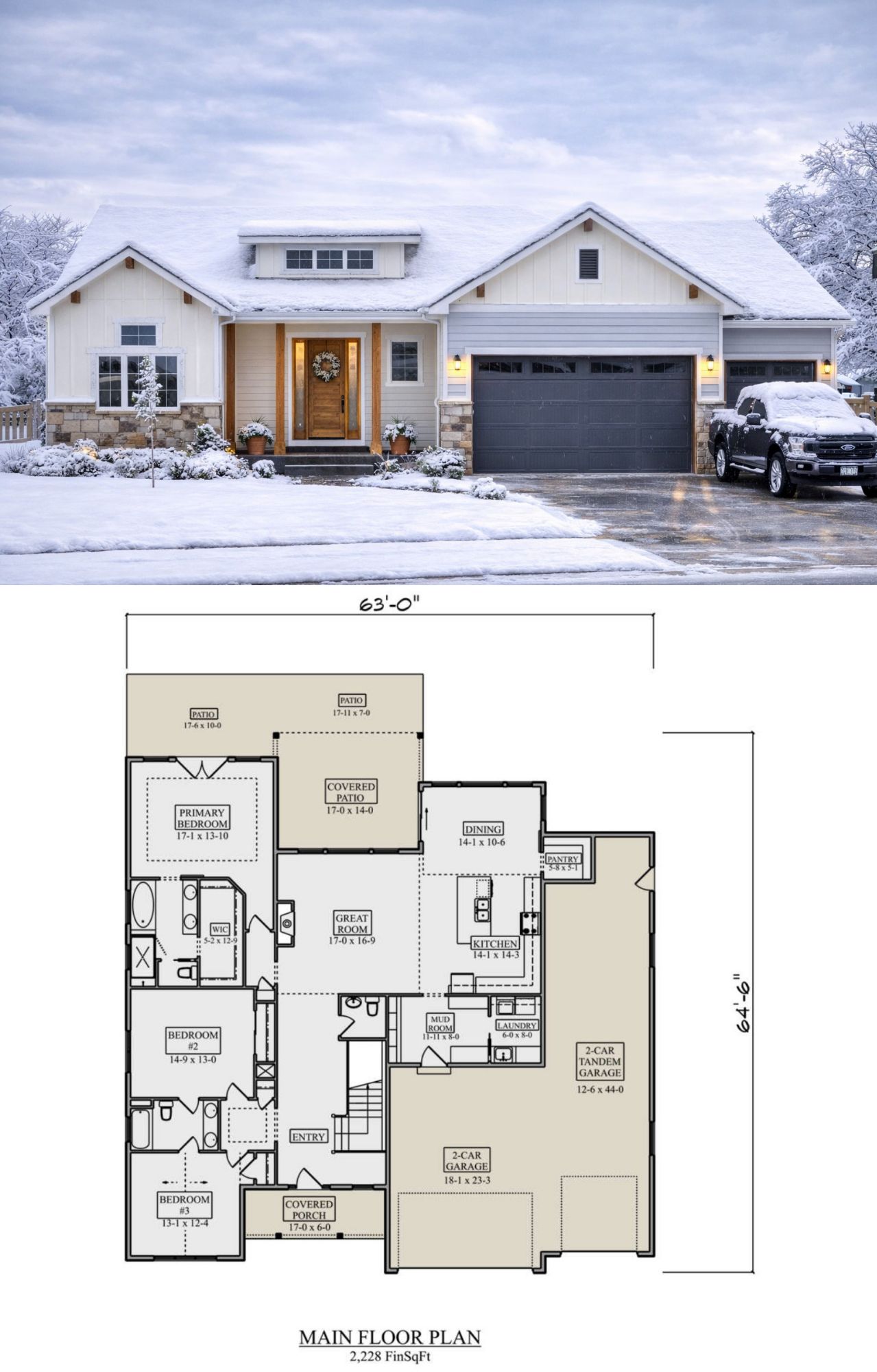 The exterior showcases classic Craftsman architecture with a wide footprint measuring approximately 63 feet wide and 64 feet 6 inches deep. This generous size gives the home a strong presence while allowing for comfortable spacing between interior and outdoor living areas. 1